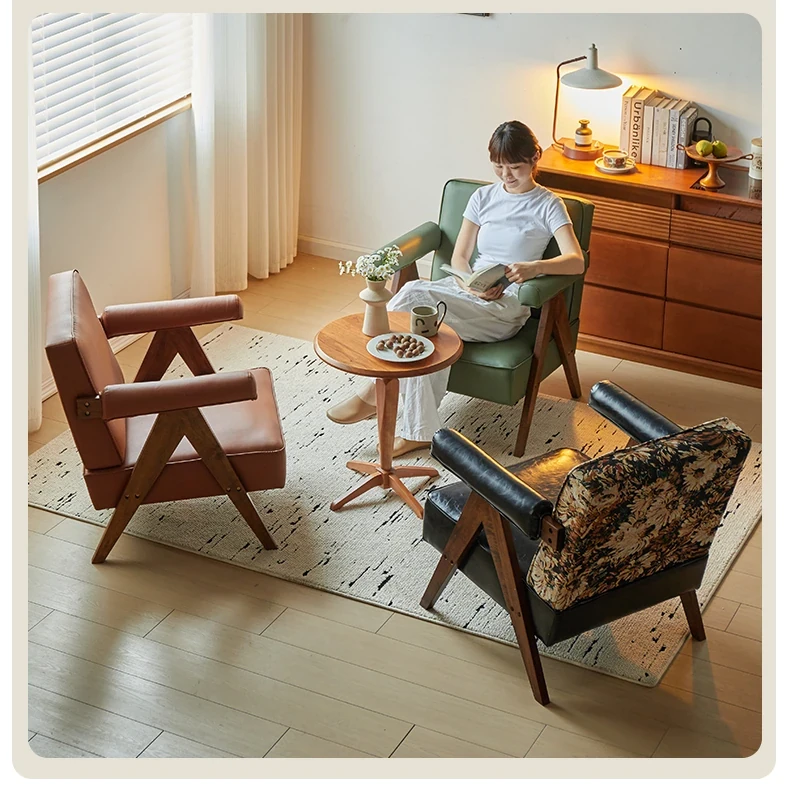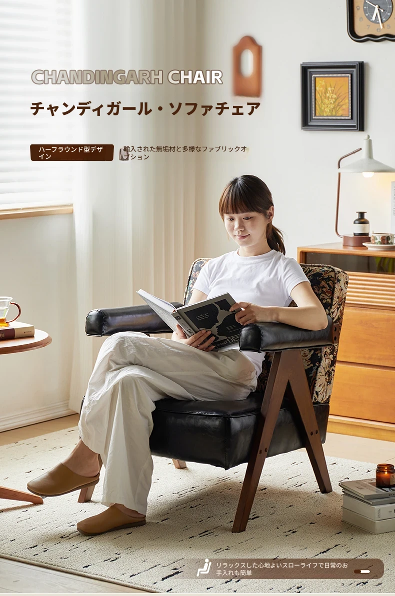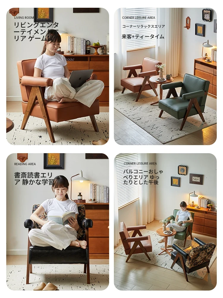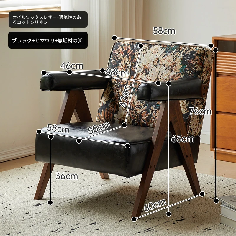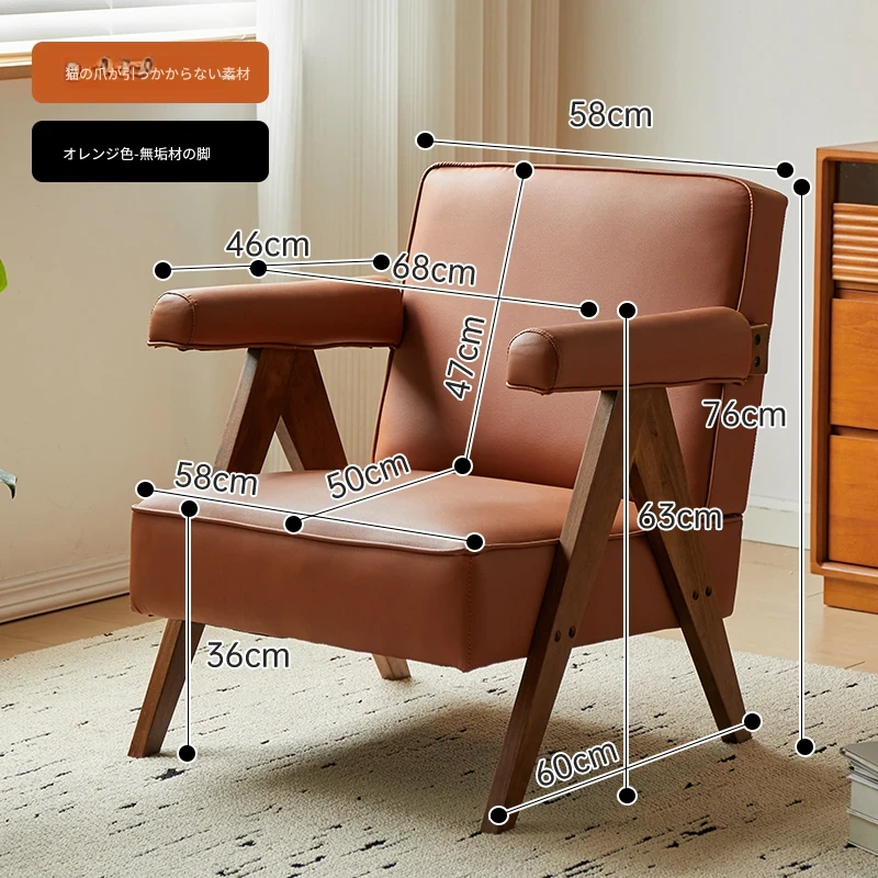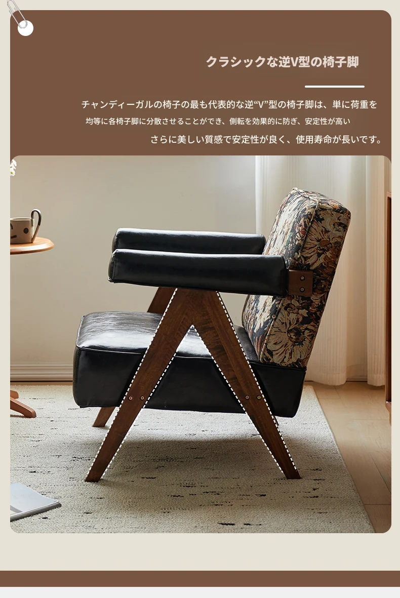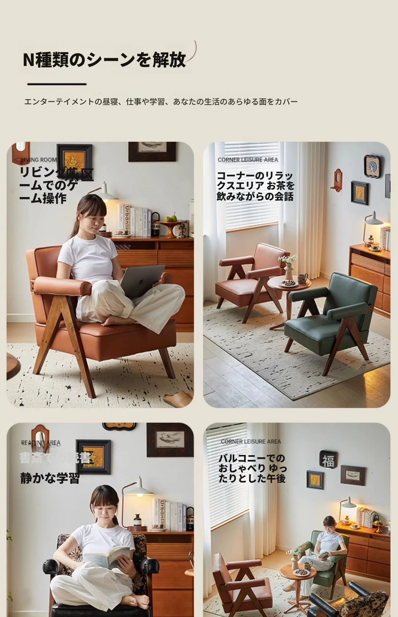 レトロな一人掛けソファ椅子 - 高級感漂う無垢材使用のリビング休憩椅子。ヴィンテージスタイルで、バルコニーにもぴったりな背もたれ付き。おしゃれで快適な空間を演出!