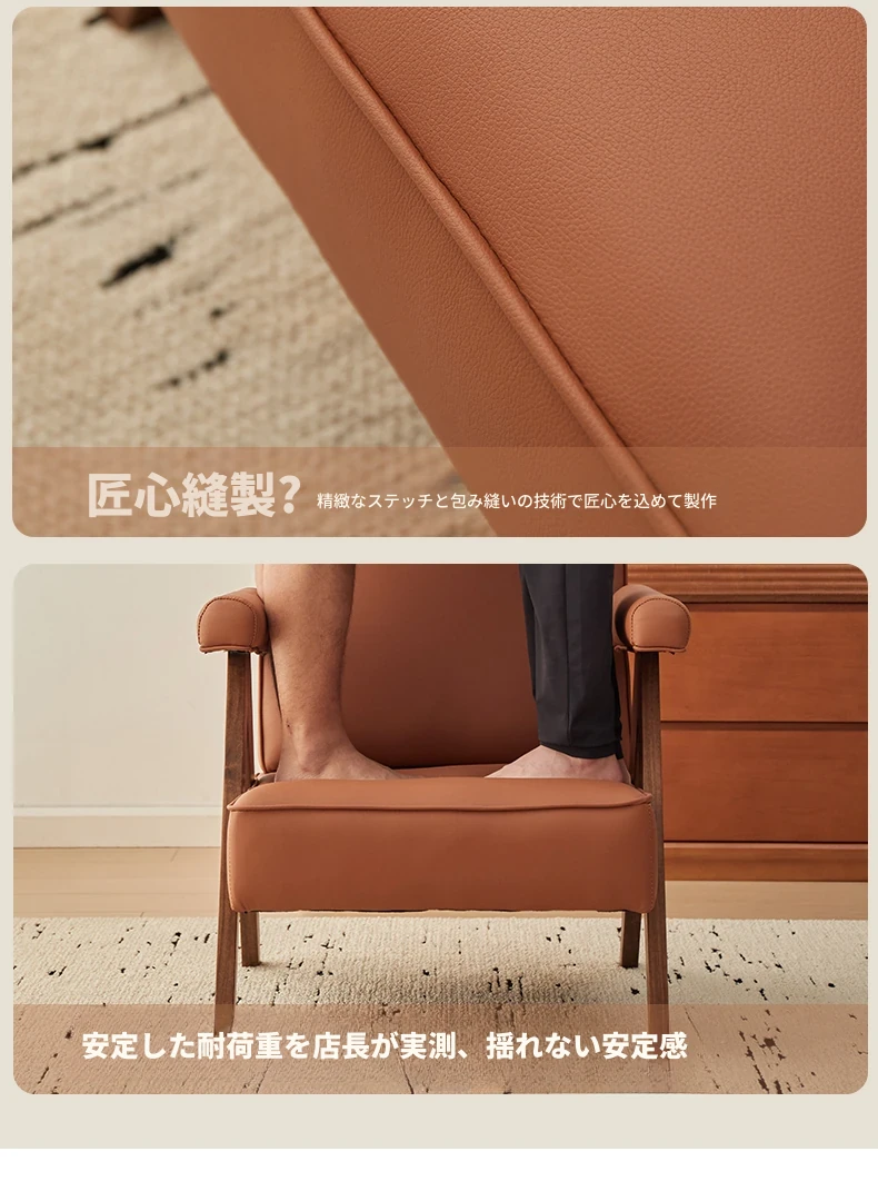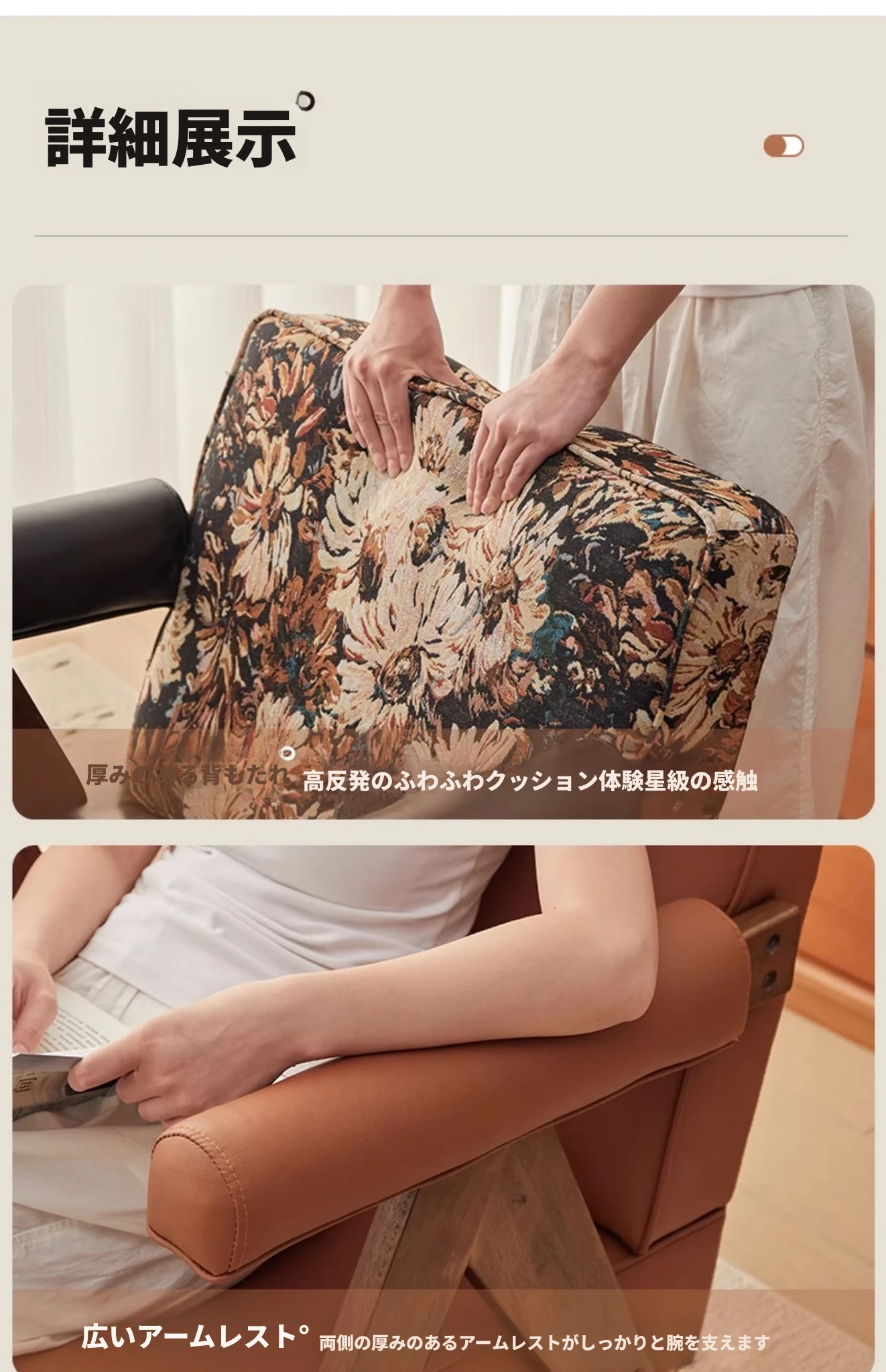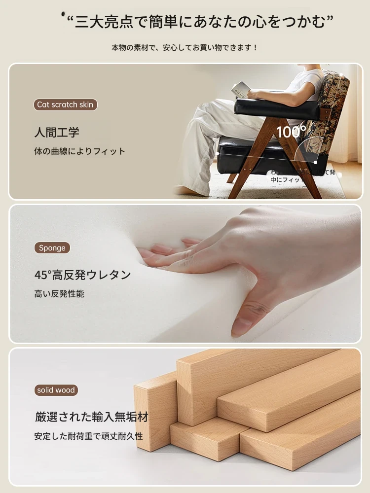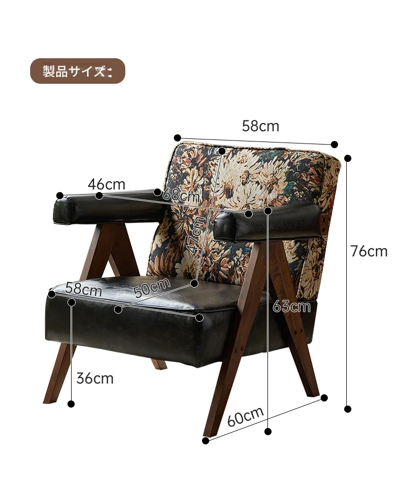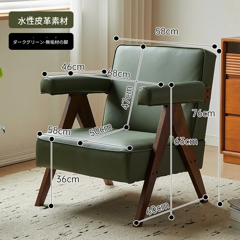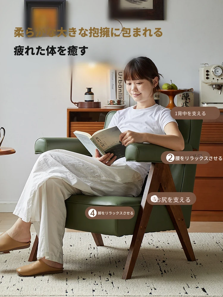 レトロな一人掛けソファ椅子 - 高級感漂う無垢材使用のリビング休憩椅子。ヴィンテージスタイルで、バルコニーにもぴったりな背もたれ付き。おしゃれで快適な空間を演出!