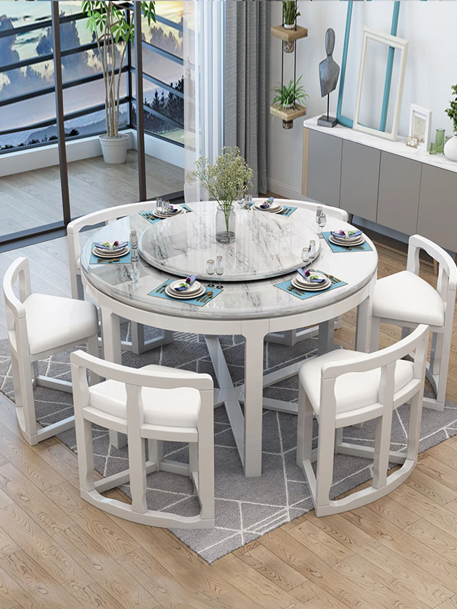 Modern Minimalist Round Marble Dining Table Set for 6 – Space-Saving Natural Solid Wood Dining Table and Chairs Combo for Home Use
