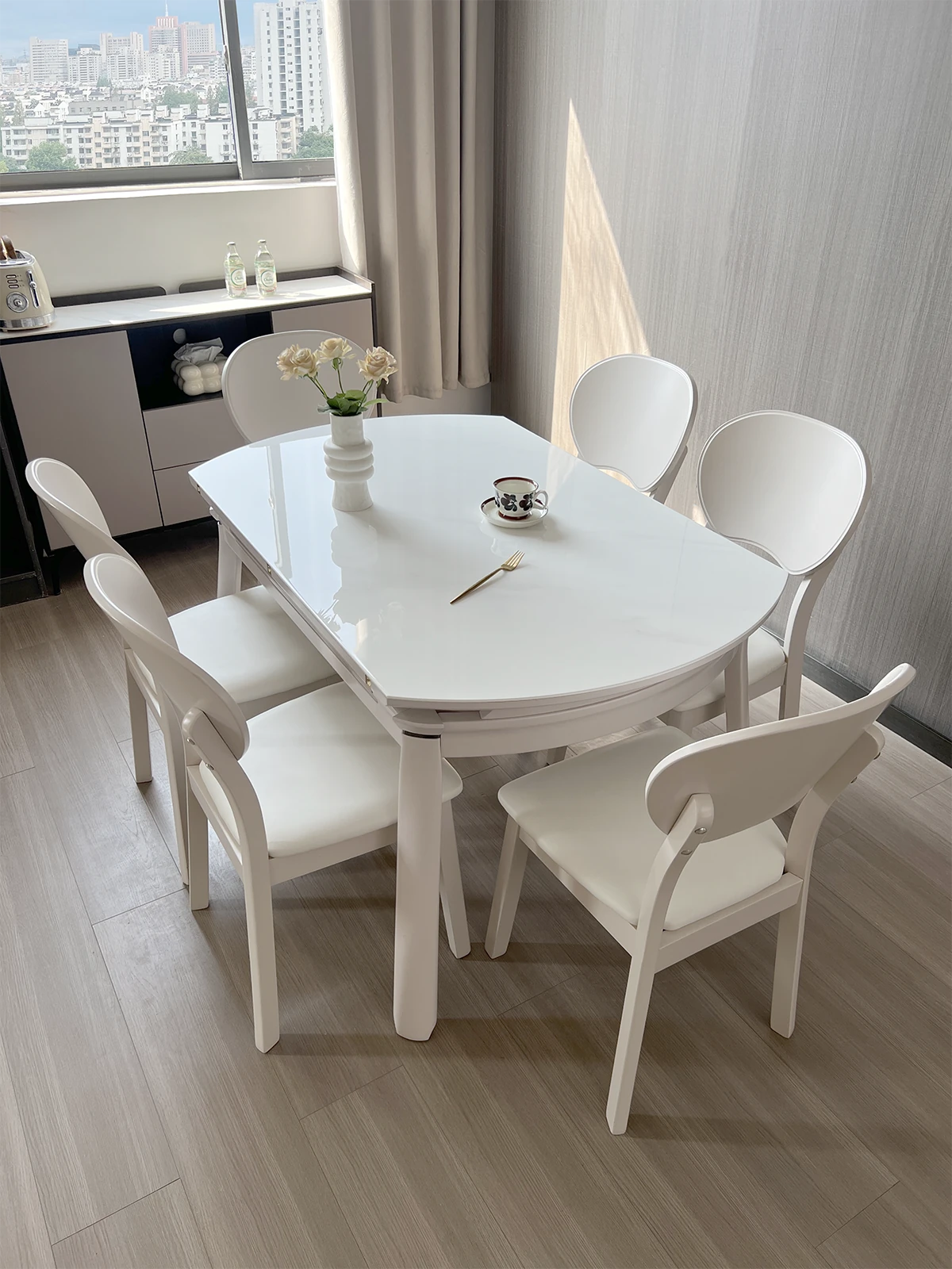 Elegant White Marble Dining Table Set with Extendable Round Design - French Cream Style, High-End Solid Wood for Home Use